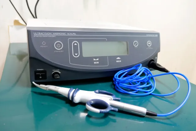 超音波エネルギーにより、血管や組織からの出血を最小限にしつつ組織を切ることができる機械なので、短時間で出血の少ない手術を実現しています。